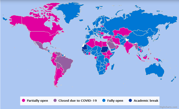 Actualmente, la Organización de las Naciones Unidas para la Educación, la Ciencia y la Cultura (UNESCO) reporta más de 224 millones de estudiantes afectados por el cierre de las escuelas, lo que representa un 12.8% del total de alumnos matriculados en el mundo. A nivel nacional, informa la institución, existen 23 naciones que todavía no han retomado las clases presenciales.