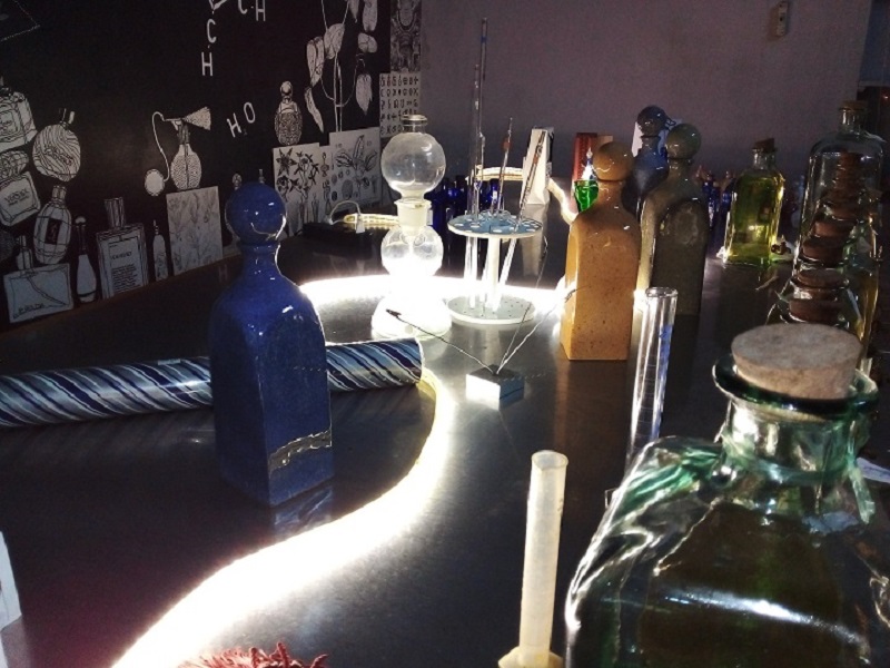 Nuestra visita concluye en el área de elaboración personalizada donde Yanelda y otras alquimistas no miden el PH de la piel, solo formulan algunas preguntan a los clientes y mediante esa entrevista pueden conocer sus gustos, preferencias y sensaciones en cuanto a olores dulces, frescos o maderables. Así crean un perfume específico para cada persona. Es un proceso que puede tardar cierto tiempo. Nos explica que hace muchos años se emplean materias primas importadas, lo cual encarece el producto final.